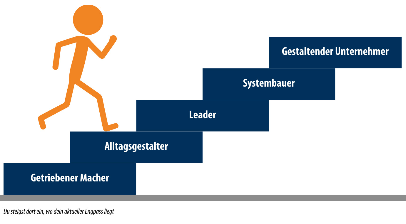 Viele Unternehmer spüren, dass sie etwas verändern müssen, wissen aber nicht genau wo sie ansetzen sollen. Die Unternehmer-Entwicklungs-Treppe gibt dir Orientierung: fünf klar definierte Entwicklungsphasen, die logisch aufeinander aufbauen und dich Schritt für Schritt vom operativ Getriebenen Macher zum Gestaltenden Unternehmer führen.